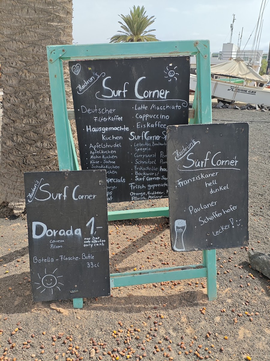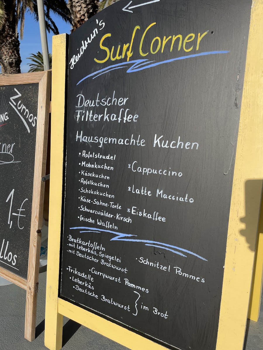 The menu at Surf Corner Lanzarote offers a variety of food and drink options influenced by German and local culinary styles. Visitors can find a selection of hot and cold beverages including coffee, fresh fruit juices, cocktails, and beer such as Kristall Weizenbier.